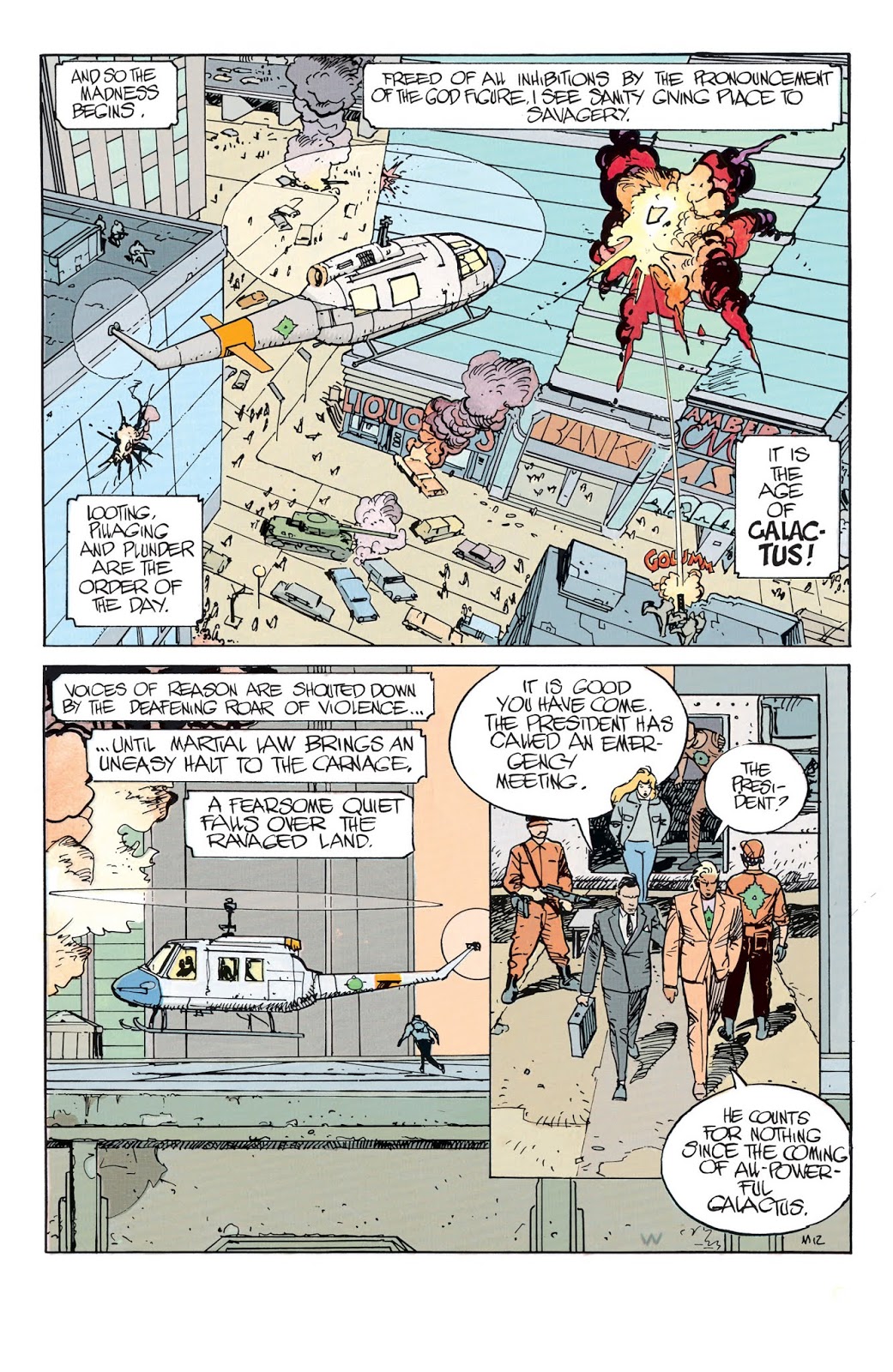 The Silver Surfer confronts his former master and demands to know why Galactus has broken his vow not to attack Earth. Galactus smugly informs his former herald that no vow has been broken, and that he has done nothing except allow humanity to destroy themselves by choosing to worship him as a God.